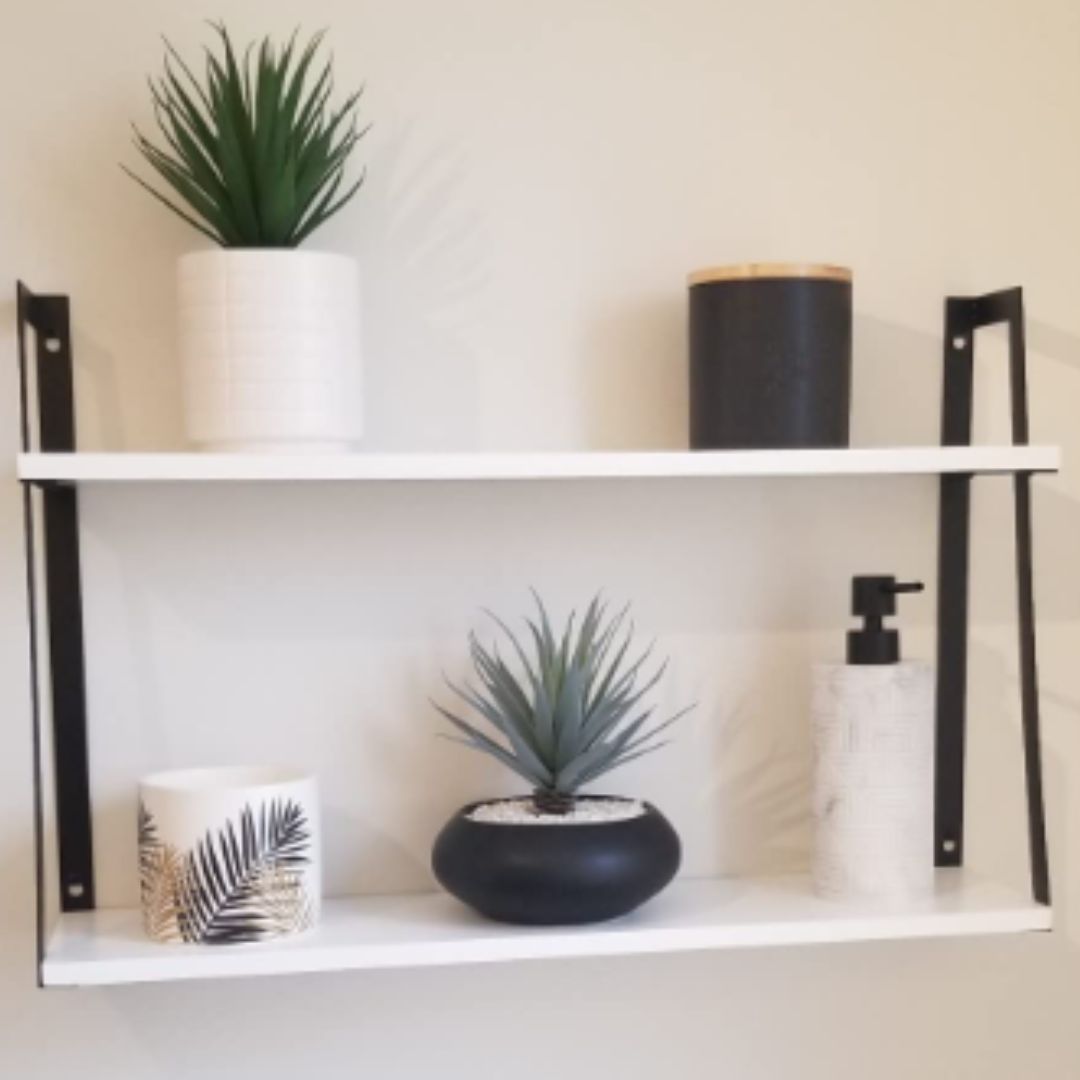 Add a retro style to your room through the torched wood with beautiful grain. Shelving solution for reducing clutter in the living room, bathroom or kitchen. 2 tier shelves with a vertical spacing of 10.3” offer more storage space.